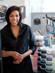 Denyse Thomasos (October 10, 1964 – July 19, 2012) was a Trinidadian-Canadian painter known for her abstract-style wall murals that conveyed themes of slavery, confinement and the story of African and Asian Diaspora. Hybrid Nations (2005) is one of her most notable pieces that features Thomasos' signature use of dense thatchwork patterning and architectonic images to portray images of American superjails and traditional African weavework.[1][2]