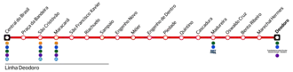 Printed in red, it serves 19 stations, many of which are in historical and important locations. Like the other commuter rail lines, the line's name comes from its first station and terminus, Deodoro. The Deodoro line was part of the Central Line of the Central do Brasil Railway.[2]