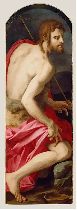 By 1553, the side panels of the saints were in storage. They were last recorded as being in the Medici inventory in 1609 and both were considered lost until the John the Baptist panel resurfaced in 1951. It is now housed in the Getty Center.[10] A fragment purportedly of the Saint Cosmas panel has recently been rediscovered, but it is suspected to be a forgery associated with art dealer Giulano Ruffini.[11][12]