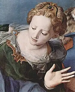 In addition to embedding donor portraits and likenesses of themselves in their works, sixteenth-century Florentine artists were known to portray other artisans and associates in their paintings and sculptures.[19] Since neither Bronzino nor his Medici employers documented the existence of embedded portraits in this work, art historians have postulated a number possibilities based on comparisons with other known portraits. Janet Cox-Rearick suggested that the central figure of Mary of Clopas was an idealized portrait of Eleonora herself[15] and that the Virgin Mother was a representation of Cosimo's mother, Maria Salviati.[20] She also proposed that Nicodemus, the unnamed companion, and Joseph of Arimathea were, respectively, portraits of Bronzino (the artist), Pontormo (his teacher), and Baccio Bandinelli (a rival artist who had submitted a modello for the altarpiece).[21] Elizabeth Pilliod has an alternative suggestion: the three companions from left to right are portraits of Giovambattista del Tasso (the architect who created Eleonora's chapel), Francesco di Ser Jacopo (a financial administrator for Cosimo), and Niccolò Tribolo (another artist in the service of the Medici).[19]