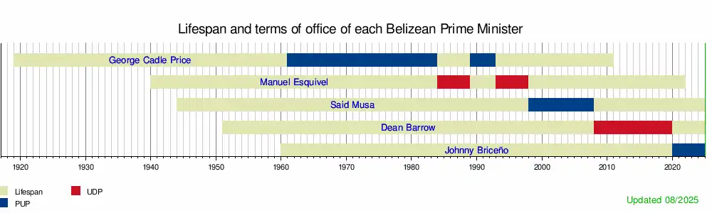 This is a graphical lifespan timeline of prime ministers of Belize. They are listed in order of office (Price and Esquivel are shown in order of their first premierships).