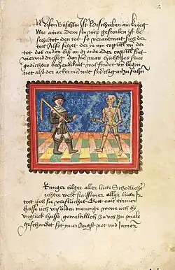 Der Ackermann aus Böhmen (German for "The Ploughman from Bohemia"), also known as Der Ackermann und der Tod ("The Ploughman and Death"), is a work of prose in Early New High German by Johannes von Tepl, written around 1401.[1] Sixteen manuscripts and seventeen early printed editions are preserved; the earliest printed version dates to 1460 and is one of the two earliest printed books in German.[2] It is remarkable for the high level of its language and vocabulary and is considered one of the most important works of late medieval German literature.