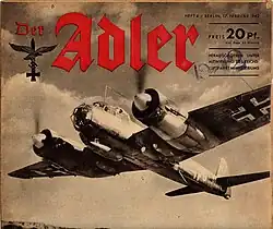 Der Adler (literally "The Eagle") was a biweekly Nazi propaganda magazine published by the Scherl Verlag, founded by August Scherl, with the support of the Luftwaffe High Command. From 1939 to 1944, 146 magazine issues were published in total. Each magazine had 24 to 36 pages, but the amount of pages was reduced to 12 when the fall of Nazi Germany was near.[1]