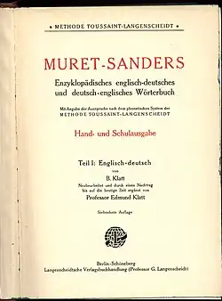 Der Große Muret-Sanders is a German–English and English–German bilingual dictionary now published by German publishing house Langenscheidt. In its original form, it was a (monodirectional) German–English dictionary in two volumes by Eduard Muret and Daniel Sanders, published in 1869. The most recent edition contains 560,000 entries in 4 volumes and is the largest German–English bilingual dictionary available; a CD-ROM edition is also available from Langenscheidt as Muret-Sanders e-Großwörterbuch Deutsch–Englisch.