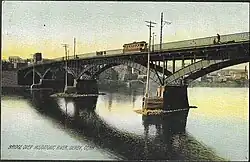 The Derby–Shelton Bridge is a road crossing over the Housatonic River in the U.S. state of Connecticut, connecting the cities of Derby and Shelton. It connects Route 34 in downtown Derby with Route 110 in downtown Shelton. The bridge and approaches are designated but not signed as SR 712. The current bridge (number 01659) was built in 1918 [3] by the Connecticut State Highway Department to replace a former steel-arch bridge built in 1891 known as the Huntington Bridge. Prior to that, an even older wooden covered bridge (built in 1857) was at this site. The Derby–Shelton Bridge used to carry two street railway tracks until the 1930s.