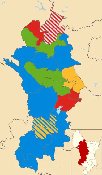 | 2023[12] | 11 | 12 | 6 | 4 | 1 | New ward boundaries. Number of councillors reduced from 39 to 34.[13] |