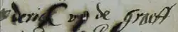 From among the Krefeld settlers, it was probably the Quakers who provided the impetus for the rejection of slavery. The 13 families from Krefeld had heard about the slave trade in the American colonies for the first time in Rotterdam on their trip to Pennsylvania. They could not imagine that they could own slaves in the land of brotherly love. However, the reality was different: Puritans and Quakers, who otherwise advocated for universal human rights, had no problems with human trafficking and did not believe it was wrong.[14] In 1688, five year after their arrival, Derick along with his brother Abraham, Francis Daniel Pastorius and Gerrit Hendricksz signed the first organized religious petition against slavery in the colonies, the 1688 Germantown Quaker Petition Against Slavery in the house of Thones Kunders.[8][15] He signed the petition with derick op de graeff.[3] It is reasonably certain that Derick presented it at the quarterly meeting to Richard Worrall and he is the only name mentioned in connection with the presentation at the annual meeting.[16]