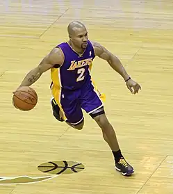 Derek Lamar Fisher (born August 9, 1974) is an American professional basketball coach and former player. He played professionally in the National Basketball Association (NBA) for 18 seasons, spending the majority of his career with the Los Angeles Lakers, with whom Fisher won five NBA championships. He also played for the Golden State Warriors, Utah Jazz, Oklahoma City Thunder, and Dallas Mavericks. Fisher has also served as president of the National Basketball Players Association (NBPA).