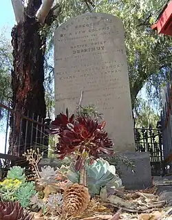 Derrimut became very disillusioned and died at the Melbourne Benevolent Asylum at the age of about 54 years[3] on 20 April 1864.[2] In his honour, over his body, interred in the Melbourne General Cemetery according to European rather than Aboriginal rites, a tombstone was erected. The text of his tombstone reads:[1]