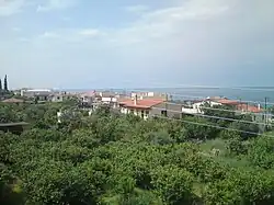 Its population stands at 941 (2021 census) but rises dramatically during the holiday season and many of the houses and flats are second residencies to people living mostly in Athens (142 km) or Patras (73 km). Its nearest main town is Corinth (50 km). One of its main characteristics is that its coastal houses and flats are flanked by the old national road to the south and give directly onto the pebbled sea shore to the north. Due to its restricted parking facilities and the infrequent train service, it is not a stop-over town for passing traffic, or amenable to day trips.