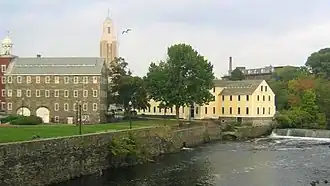 The Derwent Valley is considered the birthplace of the factory system.[21] The machines developed in the Derwent Valley such as the water frame allowed continuous production.[9] Richard Arkwright's Cromford Mill and the associated workers' settlement provided a template for industrial communities, not just in the valley but internationally. The reason a settlement was built contemporaneously with Cromford Mill was to provide housing for the workers; the only way to secure the labour the mill required was if homes were provided for the labourers and their families. The success of Arkwright's model lead to other industrialists copying him. Entrepreneurs such as Peter Nightingale, Jedediah Strutt and Thomas Evans founded the settlements of Belper, Milford, and Darley Abbey within the Derwent Valley for their employees. As well as the economic standpoint of ensuring a supply of labour, the industrialists were also concerned for their employees and families and acted out of a sense of paternalism.[33]