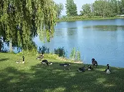 ![]() Canada geese along the shore of the park | |