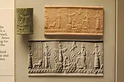 Dumuzi (or Tammuz in Babylonian) is a deity associated with abundance in Sumerian mythology. He is thought to have emerged from a process of syncretism, likely occurring in prehistoric times,[30] which involved the combination of several Sumerian deities related to vegetation[31] or livestock.[32]