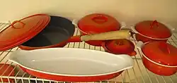 Descoware is a discontinued brand of porcelain- or enamel-coated cast-iron cookware[1][2][3] Among notable Descoware pots are dutch ovens.[2][3] Although Descoware is now little-remembered, specialist sources hold that it was the favorite cooking ware of American cooking instructor and television personality Julia Child, more so than Le Creuset, whose association with the chef has been widely reported.[4] Child regularly used Descoware on her television show The French Chef.[5] The Smithsonian Institution's installation about Child's kitchen featured a large orange Descoware pot on top of Child's own stove.[6]