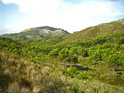 This mountain range has two ridges covered mostly with Maquis shrubland and low Mediterranean forest. There were two serious forest fires in 1985 and 1992.