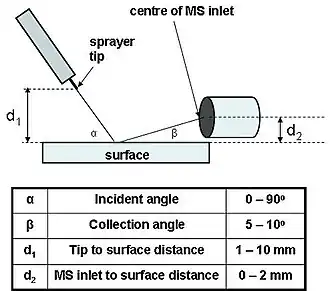 The ionization efficiency of DESI is complex and depends on several parameters such as, surface effects, electrospray parameters, chemical parameters and geometric parameters.[12] Surface effects include chemical composition, temperature and electric potential applied. Electrospray parameters include electrospray voltage, gas and liquid flow rates. Chemical parameters refers to the sprayed solvent composition, e.g. addition of NaCl. Geometric parameters are α, β, d1 and d2 (see figure on the right).