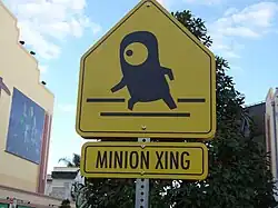 On March 11, 2013, Universal Studios Hollywood announced that they would open Despicable Me Minion Mayhem in 2014.[13] The announcement followed a series of rumours stating the park would replace the recently closed T2-3D: Battle Across Time attraction with a Despicable Me attraction.[14][15] A later announcement revealed the surrounding area would be themed to Super Silly Fun Land.[16] Despicable Me Minion Mayhem at Universal Studios Hollywood had its soft opening on March 20, 2014, and officially opened on April 12, 2014.[17] The area surrounding the ride is themed to Super Silly Fun Land, featuring a rotating Zamperla Aero Top Jet ride under the name of Silly Swirly, a water play area and a dry play area.[18] A giant statue of Stuart the Minion was erected on top of the ride's building in July 2015.