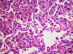 Desquamative interstitial pneumonia (DIP) is a type of idiopathic interstitial pneumonia featuring elevated numbers of macrophages within the alveoli of the lung.[1] DIP is a chronic disorder with an insidious onset. Its common symptoms include shortness of breath, coughing, fever, weakness, weight loss, and fatigue. In more severe cases, it may lead to respiratory failure, chest pain, digital clubbing, cyanosis, and hemoptysis. Asymptomatic cases are rare.