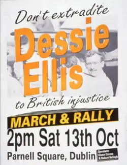 He is a former Provisional IRA prisoner. He was arrested in 1981, when explosives and bomb making equipment were found under his bed. He was charged with possession of explosives.[3] He jumped bail, but was arrested in Buffalo, New York in February 1982 and extradited to the Republic of Ireland,[3] where in April 1983, he was sentenced to ten years' imprisonment in Portlaoise Prison. He was convicted of possessing multiple power-timer units for IRA bombs, including those suspected of being used in the Hyde Park and Regent's Park bombings.[5] In 1983, Ellis' fingerprints were found on a huge cache of IRA explosives found in a forest outside the Berkshire town of Pangbourne. The cache was linked to the Harrods and Hyde Park bombings. On 14 November 1990, after thirty-five days on hunger-strike, Ellis became the first person extradited from the Republic of Ireland to the United Kingdom under the 1987 Extradition Act. He went on hunger strike to protest efforts to send him to Britain, but was extradited in the sixth week of his fast. Ellis's hunger strike drew considerable domestic and international attention, and at one point Taoiseach Charles Haughey intervened, asking Ellis' parents to ask him to give it up, but they refused.[6] Ellis was acquitted at his trial in London in October 1991.[7]