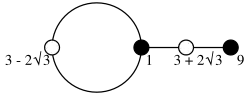 One may form a dessin d'enfant from by placing black points at the preimages of 0 (that is, at 1 and 9), white points at the preimages of 1 (that is, at ), and arcs at the preimages of the line segment [0, 1]. This line segment has four preimages, two along the line segment from 1 to 9 and two forming a simple closed curve that loops from 1 to itself, surrounding 0; the resulting dessin is shown in the figure.