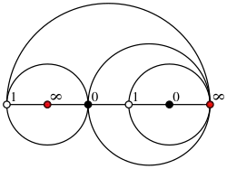 Recognizable modern dessins d'enfants and Belyi functions were used by Felix Klein.[2] Klein called these diagrams Linienzüge (German, plural of Linienzug "line-track", also used as a term for polygon); he used a white circle for the preimage of 0 and a '+' for the preimage of 1, rather than a black circle for 0 and white circle for 1 as in modern notation.[3] He used these diagrams to construct an 11-fold cover of the Riemann sphere by itself, with monodromy group , following earlier constructions of a 7-fold cover with monodromy connected to the Klein quartic.[4] These were all related to his investigations of the geometry of the quintic equation and the group , collected in his famous 1884/88 Lectures on the Icosahedron. The three surfaces constructed in this way from these three groups were much later shown to be closely related through the phenomenon of trinity.