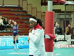 Hooker joined the U.S. women's national volleyball team in January 2008. Her first official tournament with the team was the 2010 World Grand Prix, where she helped the U.S. win the gold medal by averaging 4.76 points and 2.46 digs. She was also fifth in scoring at that year's FIVB Volleyball Women's World Championship.[1] In 2011, Hooker was named the Most Valuable Player of the FIVB World Grand Prix, as the Americans won the tournament again. She ranked second with 101 points scored during the Final Round. Hooker averaged 5.91 points and 5.13 kills in the FIVB World Cup to help the U.S. to the silver medal in that event. She was named the Best Spiker in the World Cup with a 49.53 kill percent and .419 hitting efficiency.[1]
