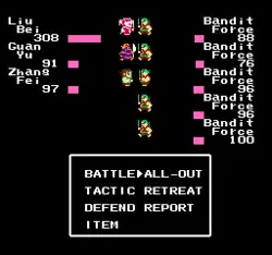 Unlike virtually every other RPG released at the time or since, the non-boss battles of Destiny of an Emperor do not consist solely of encounters with generic units. While generic enemy units do appear in the game, most random battles are fought against one or more generals randomly selected from those roaming the lands the player's party is traveling through at the time. Additionally, most of these unique units can be recruited. After being defeated in battle, there is a random chance that the general will offer to join the party, usually under the condition that the player character pays him a bribe of either money or horses (which can be purchased at item shops). Once recruited, the general will no longer be encountered in random battles.