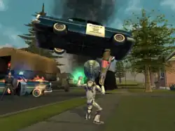 Because of this, each human contains a small amount of Furon DNA in these genetic codes. Crypto is sent to Earth to harvest this DNA from human brain stems, locate and rescue his previous clone, Cryptosporidium-136, and spearhead a Furon invasion of Earth. The game is set up in a sandbox fashion. The player has a selection of weapons and mental abilities at their disposal, as well as access to Crypto's flying saucer. Destroy All Humans! implements the Havok physics engine, allowing for ragdoll effects on bodies and destructible environments.
