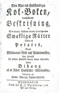 Anna Maria Rückerschöld (born Rücker; 5 February 1725 – 25 May 1805) was a Swedish writer who wrote several popular books on housekeeping and cooking in the late 18th and early 19th century. She was an advocate of women's right to a good education in household matters and propagated this view in public debate through an anonymous letter in 1770. Along with Cajsa Warg and other female cookbook authors, she was an influential figure in culinary matters in early modern Sweden.