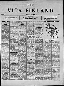 Det Vita Finland was a political newspaper published by the Whites during the Finnish Civil War. It served as the Swedish- language parallel to the Valkoinen Suomi newspaper and was published in the city of Vaasa in Pohjanmaa.[1] The Newspaper was to be published every day at 8 am, except Monday. The editors of the newspaper were Richard Malmberg, Johannes Näse and A. J. Dahl.[2]