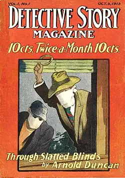 Detective Story Magazine was an American magazine published by Street & Smith from October 15, 1915, to summer 1949 (1,057 issues). It was one of the first pulp magazines devoted to detective fiction and consisted of short stories and serials.[1] While the publication was the publishing house's first detective-fiction pulp magazine in a format resembling a modern paperback (a "thick book" in dime novel parlance), Street & Smith had only recently ceased publication of the dime novel series Nick Carter Weekly, which concerned the adventures of a young detective.