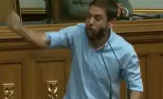 In shows of solidarity, a sign was secured to Requesens' seat in the assembly by other members, saying "kidnapped by SEBIN".[87] During the 14 August National Assembly meeting, deputy Gilber Caro stripped to his underwear in front of the assembly in a move of solidarity, to make a speech saying that a man's dignity is not dependent on his state of dress.[88] The assembly erected a large black-and-white banner hanging in the assembly hall with Requesens' face, a ribbon of the Venezuelan colours (yellow, red and blue) behind him, and the words "Liberty for Deputy Juan Requesens, kidnapped by the dictator".[89]