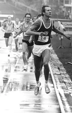 In 1982, Wagenknecht won his third national title, ahead of Beyer; at the European Championships in Athens he placed sixth.[2][4] He was ranked seventh in the world by Track & Field News, his third and final top ten appearance.[10] In 1983 he was national champion both indoors and outdoors, but was eliminated in the semi-finals at the inaugural Athletics World Championships in Helsinki; he stayed with the leading group until the end, but was outkicked.[4][11][12]