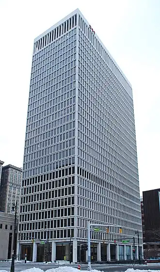 The One Woodward Avenue Building (Michigan Consolidated Gas Company Building) is a 32-story, flat-roofed skyscraper with a steel frame. It was built in 1960–62, and designed by Minoru Yamasaki and Smith, Hinchman, and Grylls; the building was apparently a model for Yamasaki's later work of the World Trade Center in New York.[20] The building rests on a platform, approached via entrance staircases, with a reflecting pool and tall glass-enclosed lobby emphasizing the airy lightness.[21] White concrete panels hold the hexagonal windows in place.[2] The three-story glass panels were the tallest ever installed at the time.[21]