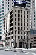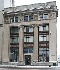 The Standard Savings & Loan Building is an 8+1⁄2-story, flat-roofed office building with a steel frame sheathed in limestone.[2] It was constructed in 1927 designed by Luis Kamper and features work by sculptor Corrado Parducci. Standard Savings & Loan was established in 1893 with offices at the corner of Griswold and Lafayette. The bank moved to the corner of Griswold and Larned in 1913, and in 1927 purchased land at the corner of Griswold and Jefferson, the site of this building. The lot is the site of first building in Detroit, the original Ste. Anne's Catholic Church, constructed in 1701.[22]
