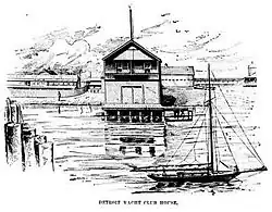 The club was founded by Detroit sailing enthusiasts in 1868.[1] The first Yacht Club buildings, a small clubhouse and boatshed, were constructed in the late 1870s at the foot of McDougall Street, just south of Jefferson Avenue. In the early 1880s, the members were divided over the club's growing social activities, and in 1882, one group broke away to form the Michigan Yacht Club. The remainder elected James Skiffington Commodore (the club's title equivalent to the "President" of other recreational and social organizations) in 1884.[1]