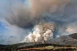 A state of emergency was declared on Tuesday, July 18, 2017, as the fire exploded to over 25,000 acres (100 km2) within the day. The entire community of Mariposa was put under a mandatory evacuation order as over 5,000 structures were threatened.[5] Yosemite National Park remained open, however some access roads were closed and the fire caused smoky conditions throughout the park.[6]