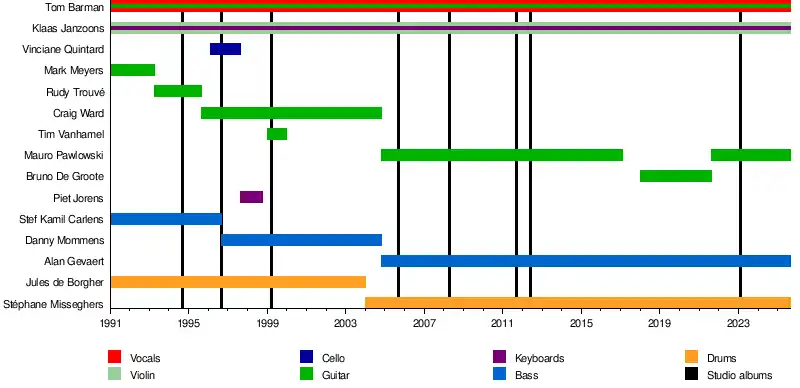 In August 2021 it was announced that Bruno De Groote had suffered a stroke the year before and was leaving to take care of his health.[17] Pawlowski rejoined, initially just to replace De Groote in their upcoming shows,[16] and then full-time. Both Pawlowski and De Groote appear on How to Replace It (released 17 February 2023) although neither are listed as members of the band. Pawlowski left the band for a second time in June 2025, initially citing health issues, but it was later confirmed by Barman in an interview in Het Nieuwsblad that he was to be replaced by Simen Folstad Nilsen full-time[18].