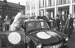 November 1990: Hans-Georg Moldenhauer , president of the NOFV, a subdivision of the DFV, receives a Trabant from DFB president Hermann Neuberger on the occasion of the DFV joining the DFB. The car is adorned with both logos.