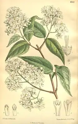 Deutzia setchuenensis, the Sichuan deutzia, is a species of flowering plant in the family Hydrangeaceae, native to southeast and south-central China.[1] The variety Deutzia setchuenensis var. corymbiflora, called the corymbose deutzia or Chinese snow flower, has gained the Royal Horticultural Society's Award of Garden Merit.[2] Growing to 2.5 m (8.2 ft) tall by 1.5 m (4.9 ft) broad, it is a deciduous shrub with flat panicles of small white flowers in early summer. It prefers full or partial sunlight, in moist fertile soil.