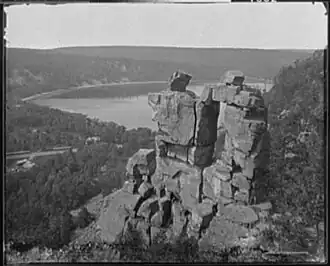 Devil's Doorway is located at the southeast corner of Devil's Lake in Devil's Lake State Park.[7] It is found on The East Bluff Trail.[8] Between 1909 and 1910 The State Park Board acquired 740 acres (300 ha) for the park and by 1911 the board had secured a total of 1,100 acres (450 ha).[9] When the park was established in 1911, there was much graffiti painted on the rocks of the formation.[10] A postcard from 1901 showed that someone had painted the initials "F.H.R." and "T.R.R." on the face of the rocks. A 2016 article in the Wisconsin State Journal stated that graffiti is reported three or four times every year and volunteers quickly remove it.[11]