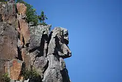 Several different myths surrounding Devil's Rock have been attributed to Native religions by European and non-Native Canadians, though none have been confirmed as part of Anishinaabe mythology. Folklorist and author John Robert Colombo has suggested that the people of Timiskaming First Nation (Algonquin: Saugeen Anishabeg, "people of the river mouth"[18]) once referred to the cliffs as "Frog Lake" in reference to a creature which, having taken the shape of a giant frog, smashed the rocks and created the formation as it exists today.[19] Bill "Backroads Bill" Steer, founder of the Canadian Ecology Centre, claims there is an Anishinaabe legend in which Devil's Rock was home to the Memequayshowak, diminutive creatures known in English as "rock demons".[13] In this telling of events, an Anishinaabe raiding party captured one of the demons and his knife, but one of the surviving Memequayshowak was able to retreate into the cliff's crevices and create such intimidating reverberations that the attackers withdrew and threw the dagger back to the cliffs, which they now believed contained an entrance to the underworld.
