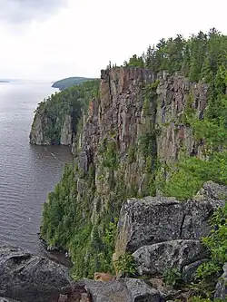 Devil's Rock (also known as Devils Rock; Anishinaabe: Mani-doo Aja-bikong[1] or Manidoo Wabikong) is a granite escarpment located 5 kilometres (3 mi) south of Temiskaming Shores, Ontario, Canada. The cliffs rise 300 feet (91 m) above Lake Timiskaming and extend nearly as far underwater as they do above, giving Devil's Rock a cliff face roughly 600 feet (180 m) tall.[2]