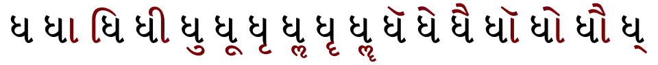 | Dha | Dhā | Dhi | Dhī | Dhu | Dhū | Dhr | Dhr̄ | Dhe | Dhai | Dho | Dhau | Dhä |