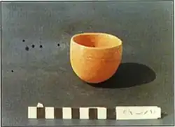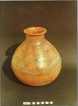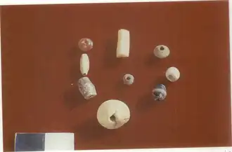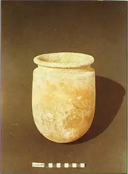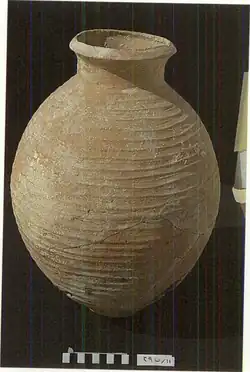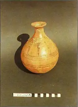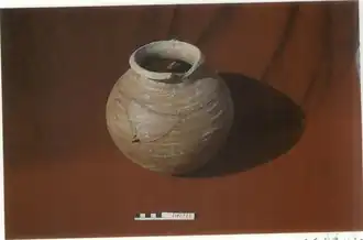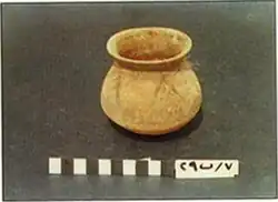Significant quantities of "Dilmun pottery" similar to those found in Bahrain burials were discovered, along with locally manufactured pieces. These included cylindrical jars, pear-shaped vessels, ribbed and barbarian pottery, burned grey pottery, and bowls. Painted pottery and various types of beads were also found.[4][3]