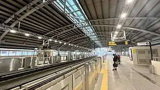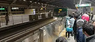 Line 6 consists of 16 operational elevated stations of 180 m (590 ft 7 in) length each, and 20.1 km (12.5 mi) of electricity-powered light rail tracks. All of line 6, save for the depot and some of its accompanying LRT, will be elevated above current roads. Mostly, this will be above road medians to allow traffic flow underneath, with stations also elevated. The Dhaka Metro is projected to serve more than 60,000 passengers per hour by 2022 with headways of approximately 4 minutes.[34] The entire route can be travelled in less than 40 minutes at a speed of 100 km/h (62 mph), and is expected to drastically reduce the number of private cars on Dhaka's streets as well as their potentially 7-hour-long standstills.[36][37] The system is using magnetic contactless Integrated Circuit Ticketing, commonly known as smart cards.[8] Platform screen door (PSD) barriers used at the platform level will increase safety and increase efficiency.[8] Trains of six spacious air-conditioned cars will arrive every four minutes going each way at each of the 16 stations.[37]