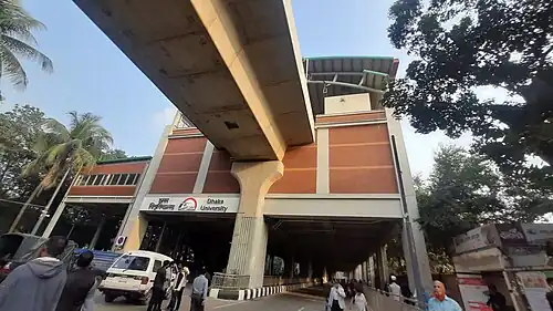 Dhaka University (Bengali: ঢাকা বিশ্ববিদ্যালয়, romanised: Dhaka Bisshobiddaloy), also sometimes unofficially and colloquially referred to as TSC station, is an elevated metro station on MRT Line 6 of the Dhaka Metro Rail.[2] This station is in the University of Dhaka campus, next to the Teacher-Student Centre and close to the Curzon Hall, located in Shahbagh Thana. The station commenced service on 13 December 2023.[3]