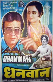 Dhanwan is a 1981 Hindi film starring Rajesh Khanna in the lead role, paired opposite Reena Roy and produced by Sohanlal Kanwar. The supporting cast includes Aruna Irani, Rakesh Roshan, Shakti Kapoor, Om Prakash and Vijayendra Ghatge. Rakesh Roshan was nominated for the Best Supporting Actor at the Filmfare Awards, the only one for the film. Reena Roy plays the role of a defiant widow who reforms the egotistical Rajesh Khanna in the film. Music is by Hridayanath Mangeshkar and Lyrics by Sahir Ludhianvi.