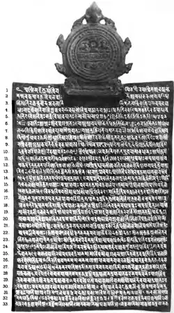 - Dated in the 32nd regnal year, this copper plate is inscribed by Tatata, who was the son of Subhata and grandson of Bhojata. It records Dharmapala's defeat of Indrayudha and the installation of his tributary Chakrayudha at Kannauj. It states that the kings of Bhoja, Matsya, Madra, Kuru, Yadu, Yavana, Avanti, Gandhara, and Kira (possibly Kangra) attended the imperial assembly and approved it. It further states that Dharmapala granted four villages to a feudal lord called Naryanavarman for the construction and maintenance of a temple dedicated to the Lord Nanna-Narayana,[21][22] with the boundaries of the donated villages including a shrine constructed for the Goddess Kadamvari.[23] The dyutaka or emissary of this plate is Yuvaraja (Crown Prince) Tribhuvanpala.