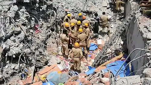 ![]() ![]() (top) Rescuers rescuing the trapped. (bottom) Visual after the building collapse on the 4th day of the incident. | |